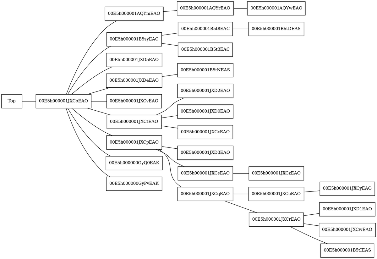 ■Idじゃわかりにくいので、上記のPNG出力の直前をparentファイルに書き出して、 最後に「&」に意味を持たせないように変換したsedコマンドをawkで作ってparentを書き換えるよう実行(sh)したものをPNG化。 $ awk -F^ '!/PARENTROLEID/{gsub("\042\042","Top",$NF);gsub("\042","",$NF);gsub("\042","",$1);print "["$NF"] -- ["$1"]" | "sort -uV"}' \ de_usertole_linux.csv | graph-easy --dot > parent $ cat de_usertole_linux.csv | tr -d '\042' | \ awk -F^ 'BEGIN{printf "sed "}!/NAME/{print " -e \047s%"$1"%"$2"\\\\n"$1"%g\047 \\"}END{print " parent"}' | \ sed -e 's/&/\\&/g' | sh | graph-easy --dot | dot -Tpng -o parentName.png